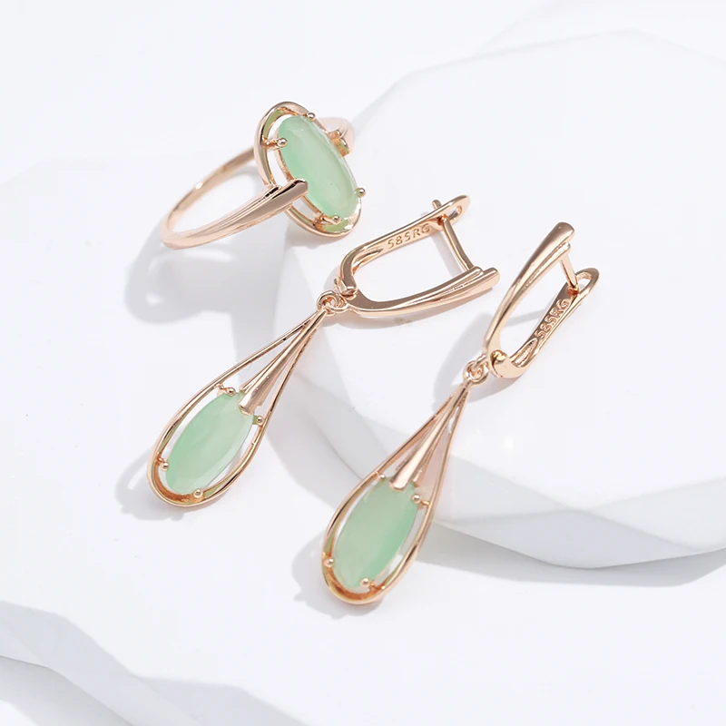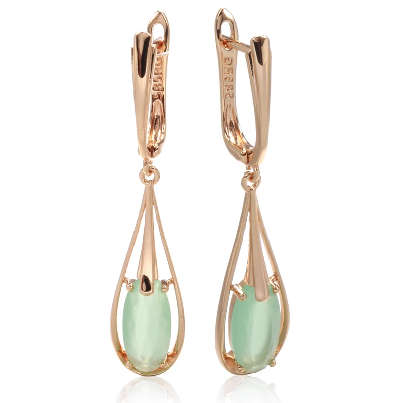 🌿 Elongated, teardrop-shaped jade stones exhibit a serene green hue, creating a captivating contrast against the warm tones of the rose gold plating.